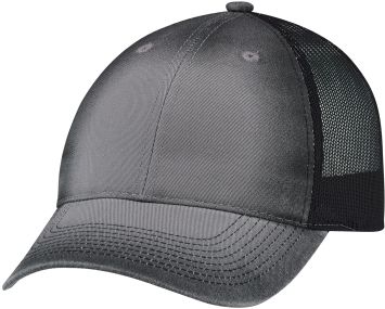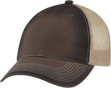 Enzyme Washed Deluxe Chino Twill/Soft Nylon Mesh/Stained Trim 6 Panel Constructed Full-Fit cap with buckram laminated front panels with Pro-stitch and pre-curved peak with 8 rows of stitching plus plastic adjustable back strap.