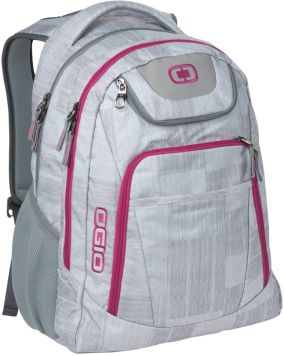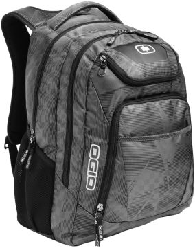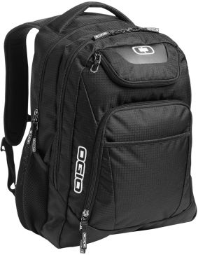 OGIO® Excelsior backpack top padded grab handle and main zippered compartment with padded sleeves plus front zippered pockets.