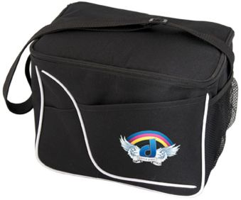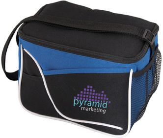 Amber Cooler bag is 9.25" W x 7" H x 5.5" D in size and made of 600D Polyester with a white PEVA liner and zipper closure. It comes with an adjustable/non-detachable webbed shoulder strap and side mesh pocket and can hold six cans. Plus it has two open front pockets