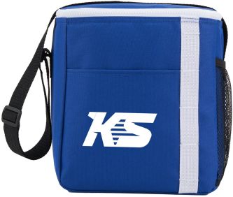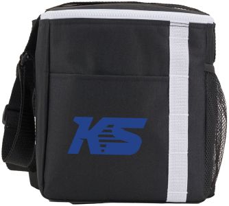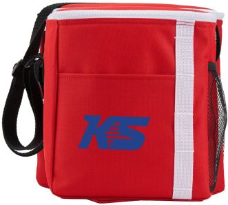 The Accent 12 Can Lunch Cooler is great for on the go! Holding up to 12 cans this cooler is easy to carry with adjustable straps. Featuring loops for pens or other accessories. This cooler is made with recycled materials.