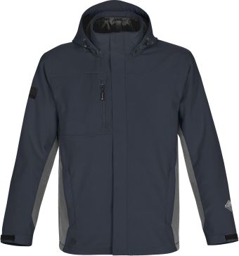This 3 in 1 Atmosphere jacket comes with 97% Polyester, 3% Spandex Bonded shell with 100% Polyester Fleece lining and 100% polyester liner with center front zipper and articulated adjustable hood plus welded adjustable cuffs and detachable hood and zippered pockets