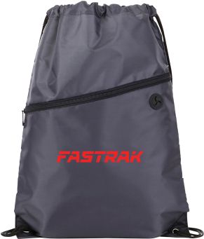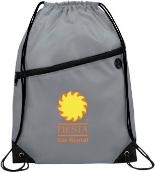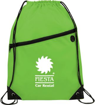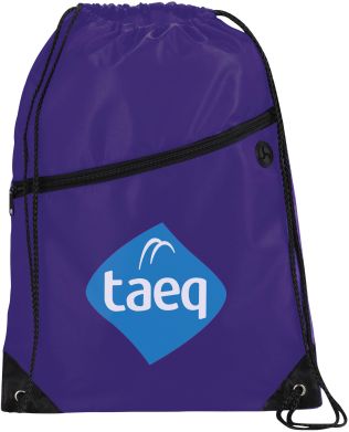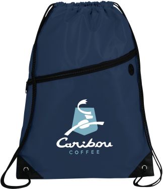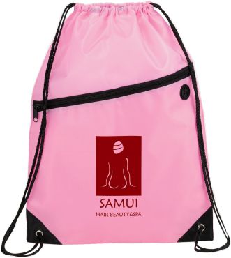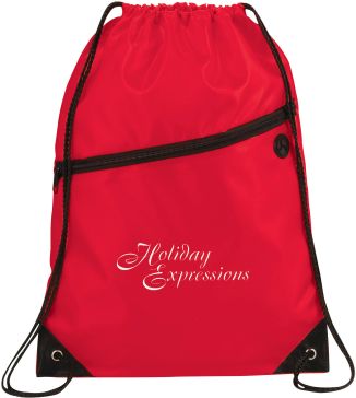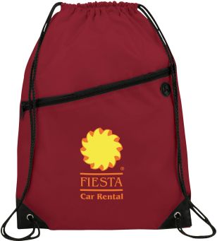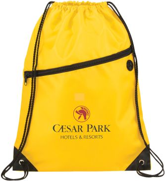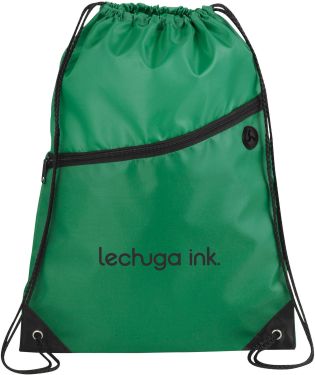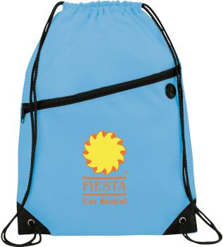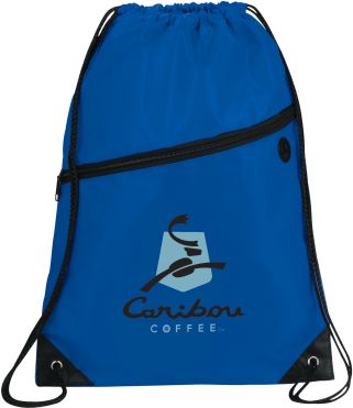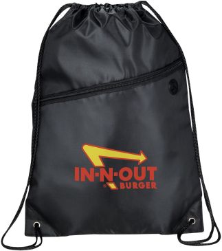 The Robin Drawstring Cinch Backpack. Large main compartment with drawstring rope closure. Zippered front pocket with earbud port. Reinforced corner tabs. Earbuds not included.