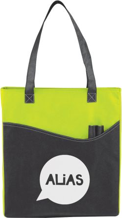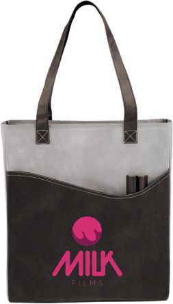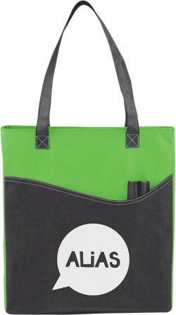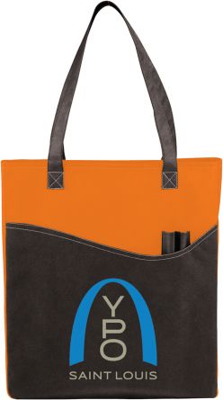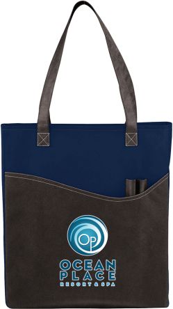 The Rivers Pocket Non-Woven Convention Tote has lots of storage including an open main compartment, front pocket and two pen pockets.  Material: 80g Non-Woven Polypropylene makes it a reusable tote and comes with 26-inch handles. Gusset & Handle Decorating does not qualify for one day turn. This tote is available in multiple colors.