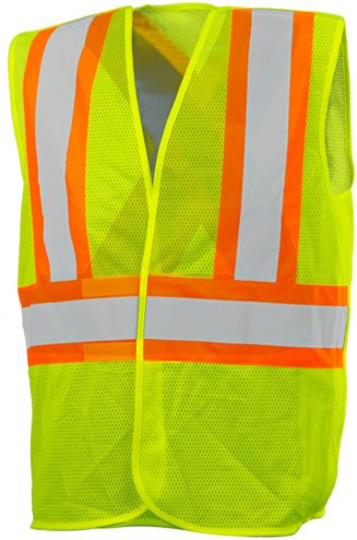 5 Pt. Tearaway Mesh Traffic Vest, 4" Refl. Tape, No Pockets. Made with breathable HI-VIS Polyester mesh fabric with 4” contrasting colour tape with 2” reflective silver tape on front, back and waist provides increased visibility. Has adjustable front hook and loop closure. Complies with CSA Z96-15 ANSI/ISEA 107-2020 Class 2 Level 2.