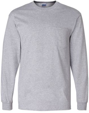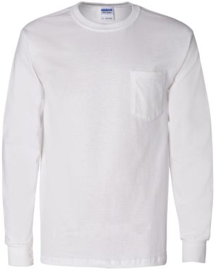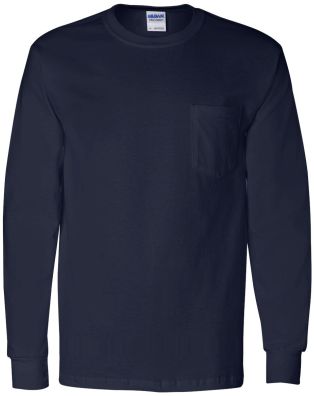 Gildan(2410) 100% cotton long sleeve pocketed T shirt. Preshrunk jersey knit 10.1 oz. Double-needle 7/8” collar. Taped neck and shoulders. Double needle, left chest 5-point pocket. Rib cuffs. Double needle bottom hem. Quarter-turned to eliminate center crease