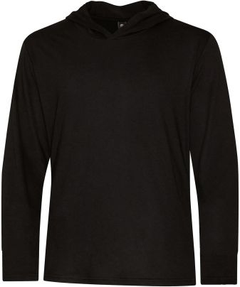 KOI® Element Triblend long sleeve hooded T shirt made of 7.6-oz, 50/25/25 polyester/cotton/rayon combed and ring spun cotton and ultra soft 32 single triblend jersey with taped neck and shoulders for comfort and durability and a 3-panel hood