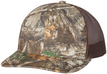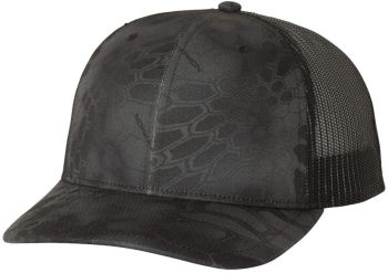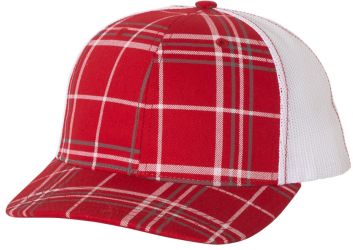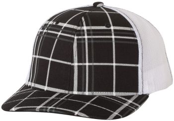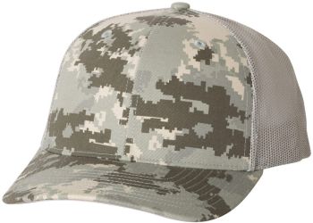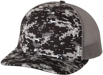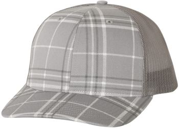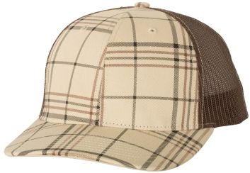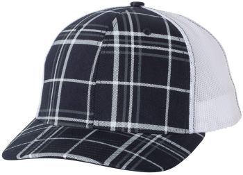 Patterned cotton/polyester blend snapback trucker cap structured mid-profile, six-panel with adjustable plastic snapback closure.