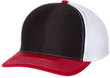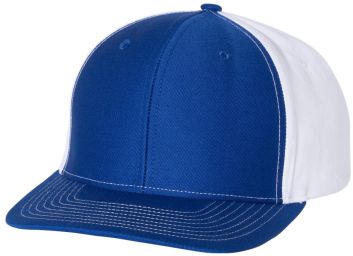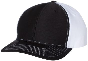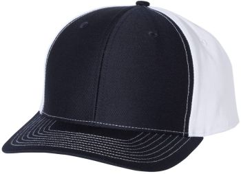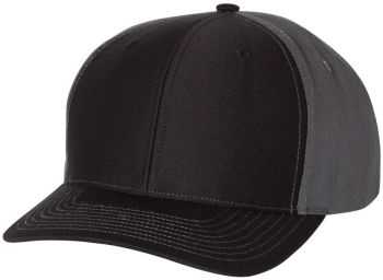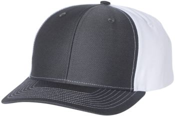 Twill back trucker structured, mid-profile, six-panel cap with 60/40 cotton/polyester front and 100% polyester back with pre-curved contrast stitch visor with adjustable plastic snapback.